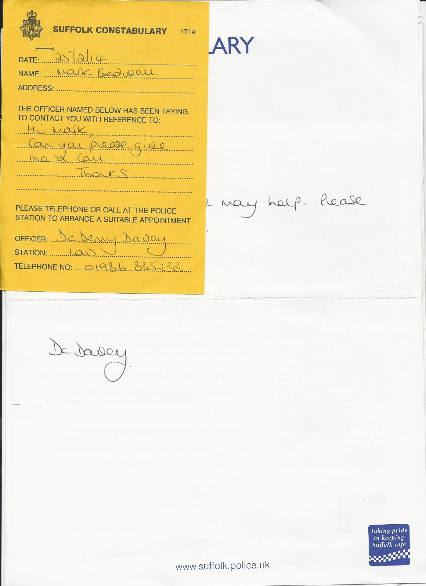 I called her back the same day. DC Davey claimed not to have my telephone number, but even if this was not the case, she could have easily got it from or informed my solicitor who could have passed the information on to me.